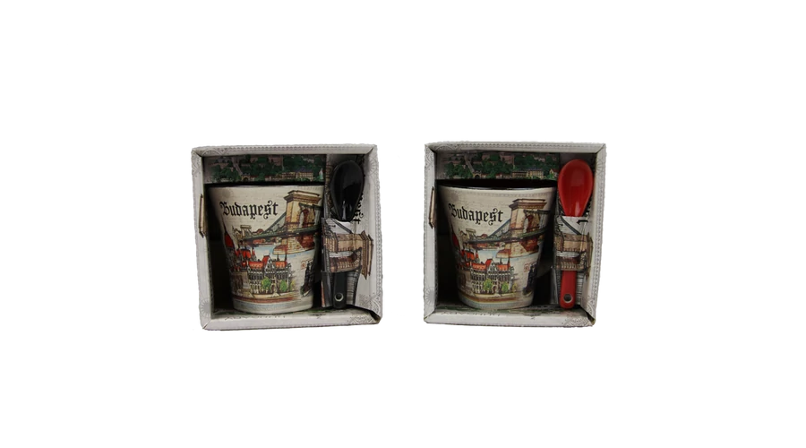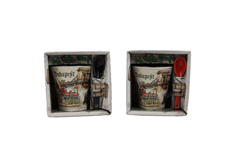 Bögre a Souvenir1 ajándék nagykereskedés kínálatában. Rengeteg színben, mintával kaphatók még szuvenír bögrék. Budapest főbb nevezetességeivel - Parlament, Budai Vár, Halászbástya, Lánchíd - ellátott színes kávés bögre, kerámia kanállal.