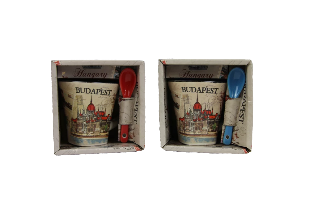Bögre a Souvenir1 ajándék nagykereskedés kínálatában. Rengeteg színben, mintával kaphatók még szuvenír bögrék. Budapest főbb nevezetességeivel - Parlament, Budai Vár, Lánchíd - ellátott színes kávés bögre, kerámia kanállal.