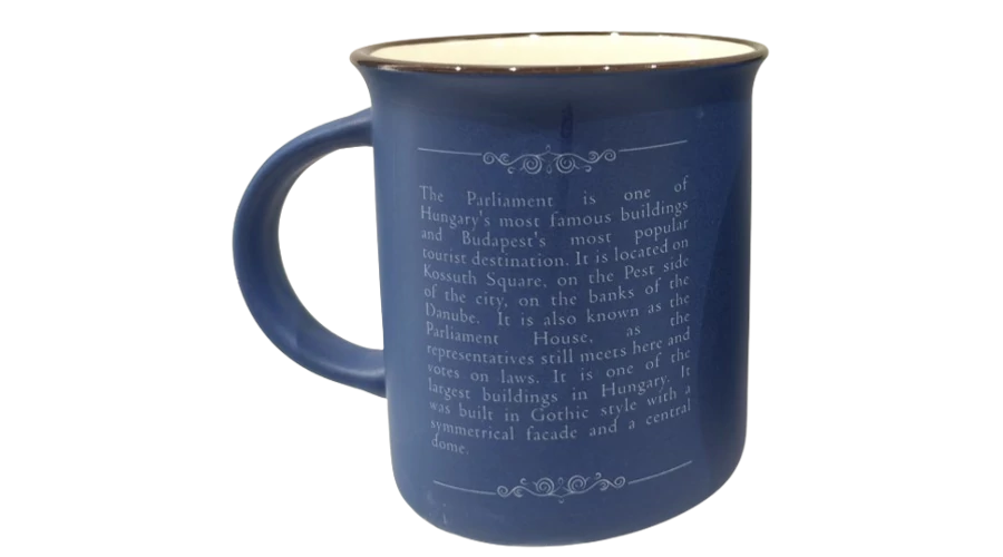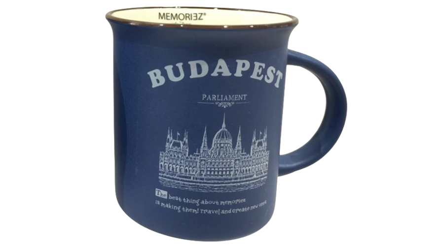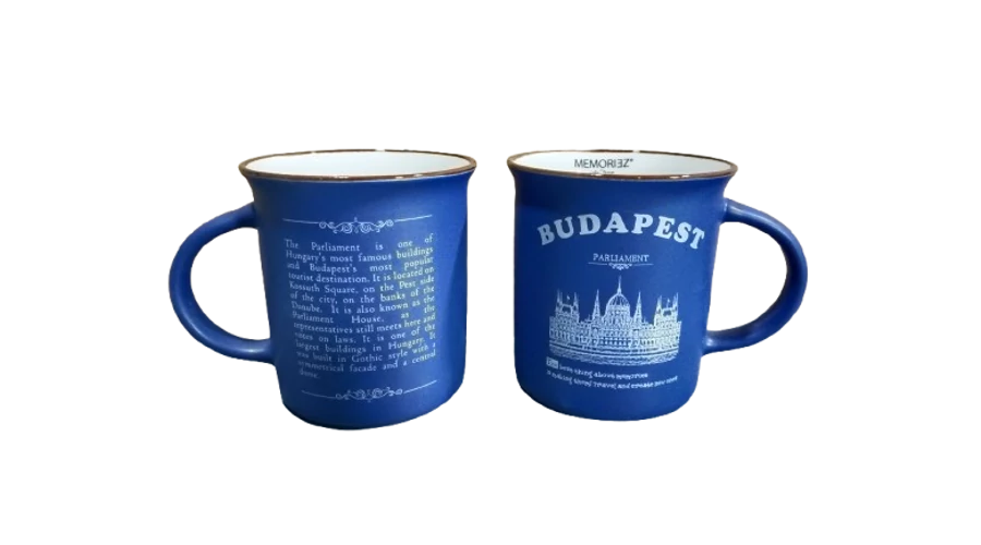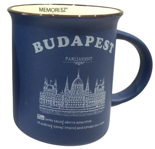 Bögre a Souvenir1 ajándék nagykereskedés kínálatában. Rengeteg színben, mintával kaphatók még szuvenír bögrék. Budapest főbb nevezetességeivel - Parlament, Budai Vár, Halászbástya, Lánchíd - ellátott színes kávés bögre, kerámia kanállal.