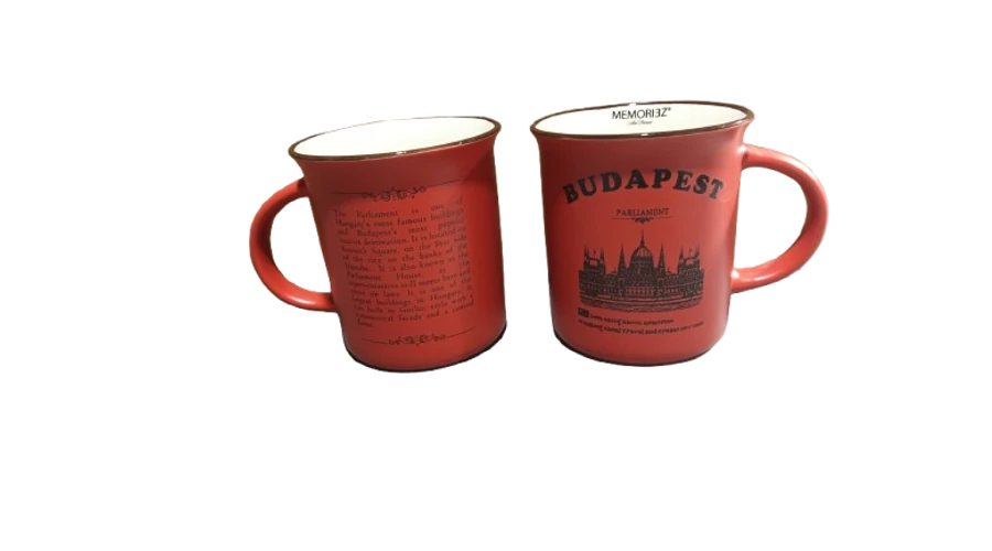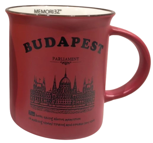 Bögre a Souvenir1 ajándék nagykereskedés kínálatában. Rengeteg színben, mintával kaphatók még szuvenír bögrék. Budapest főbb nevezetességeivel - Parlament, Budai Vár, Halászbástya, Lánchíd - ellátott színes kávés bögre, kerámia kanállal.