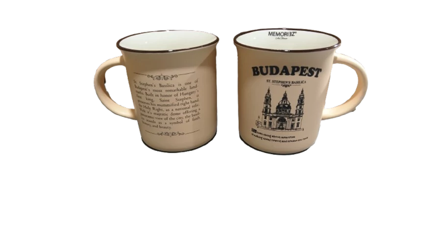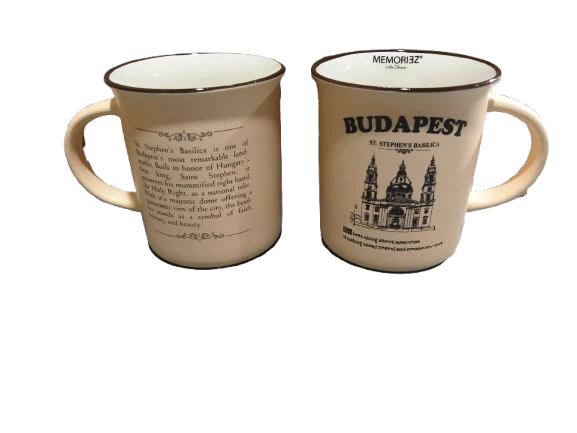 Bögre a Souvenir1 ajándék nagykereskedés kínálatában. Rengeteg színben, mintával kaphatók még szuvenír bögrék. Budapest főbb nevezetességeivel - Parlament, Budai Vár, Halászbástya, Lánchíd - ellátott színes kávés bögre, kerámia kanállal.