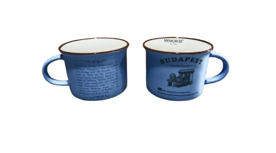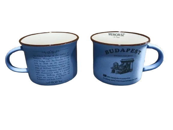 Bögre a Souvenir1 ajándék nagykereskedés kínálatában. Rengeteg színben, mintával kaphatók még szuvenír bögrék. Budapest főbb nevezetességeivel - Parlament, Budai Vár, Halászbástya, Lánchíd - ellátott színes kávés bögre, kerámia kanállal.