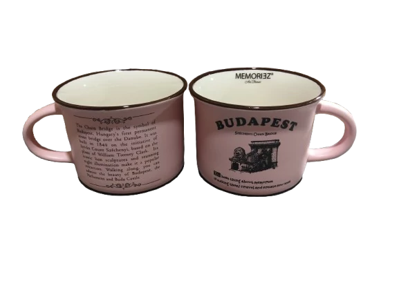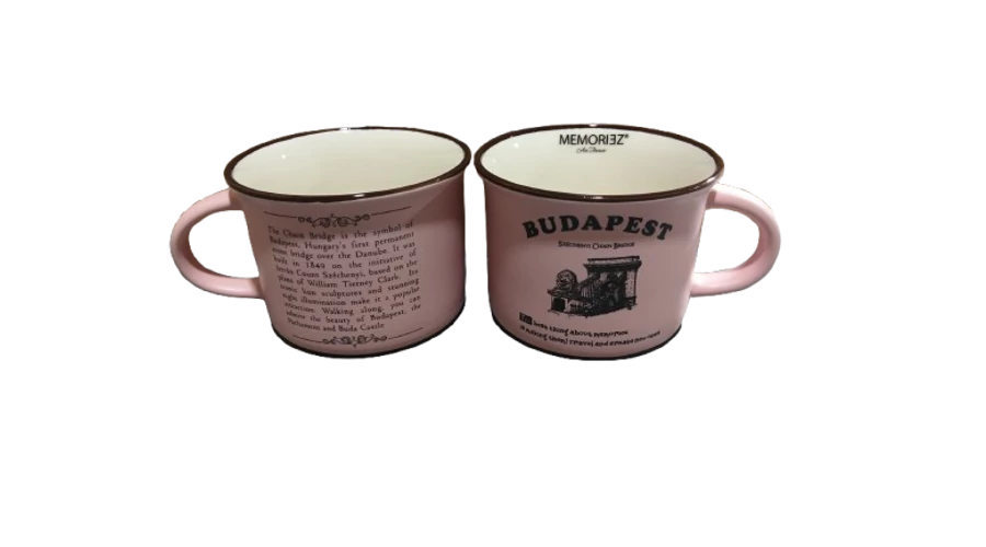 Bögre a Souvenir1 ajándék nagykereskedés kínálatában. Rengeteg színben, mintával kaphatók még szuvenír bögrék. Budapest főbb nevezetességeivel - Parlament, Budai Vár, Halászbástya, Lánchíd - ellátott színes kávés bögre, kerámia kanállal.