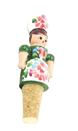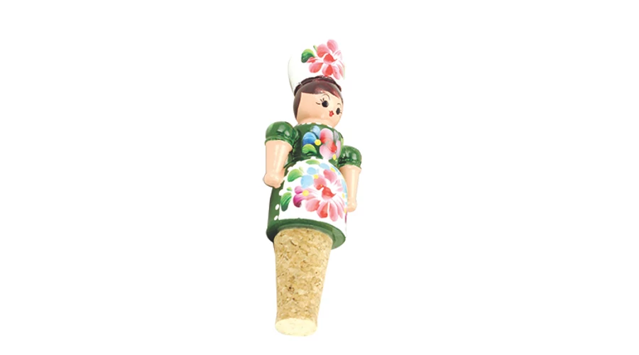Bordugó a Souvenir1 ajándék nagykereskedés kínálatában. Népies, hagyományőrző szuvenír. Fából készült, kézzel festett lány figura, parafa dugóval.