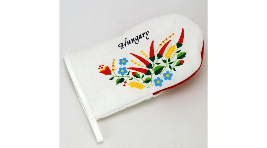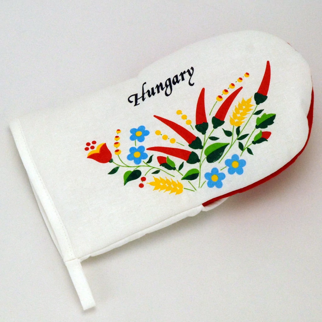Edényfogó kesztyű a Souvenir1 ajándék nagykereskedés kínálatában. Textil edényfogó kesztyű kalocsai mintával, Hungary felirattal.