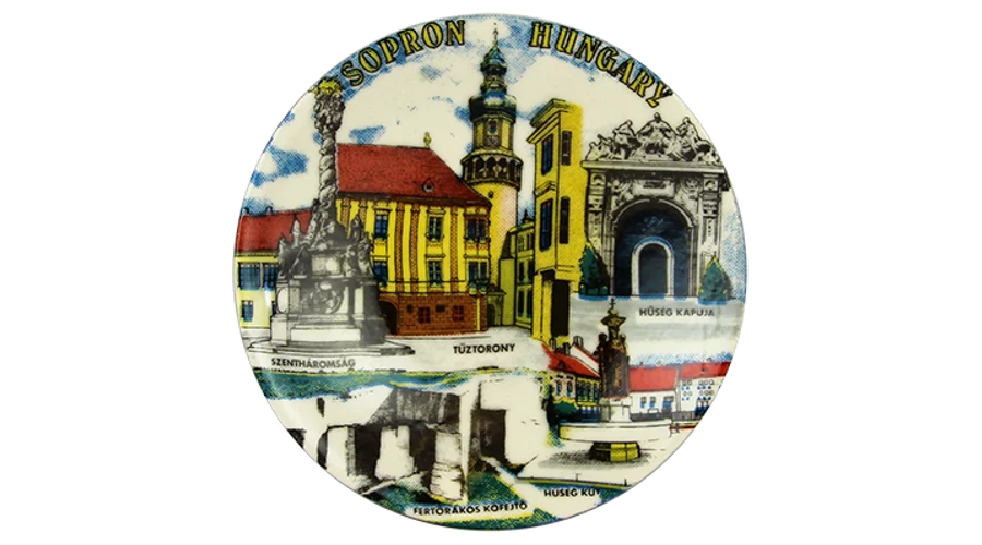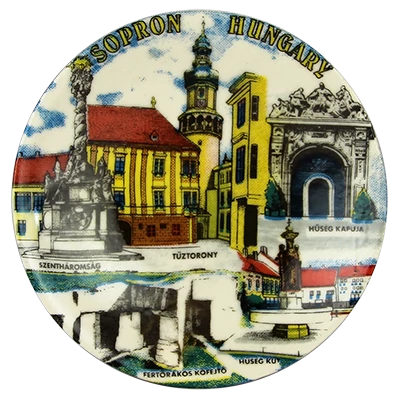 Falitál a Souvenir1 ajándék nagykereskedés kínálatában. Porcelán falitál, Sopron nevezetességeinek színes grafikájával, Sopron felirattal.