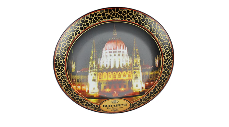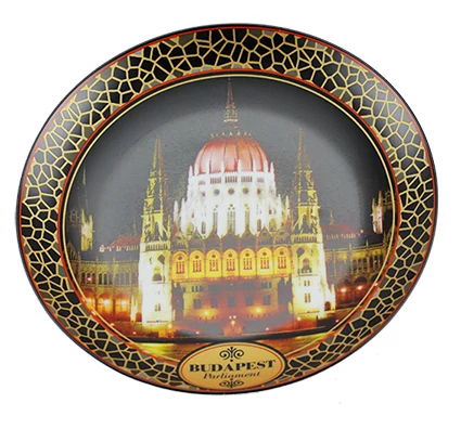 Hűtőmágnes a Souvenir1 ajándék nagykereskedés kínálatában. Rengeteg színben, mintában kaphatóak még a szuvenir falitálak. A Parlament képe látható éjszakai kivilágításban. Porcelánból készült, tál alakú mágnes.
