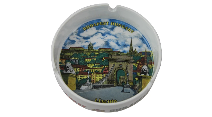 Hamutál a Souvenir1 ajándék nagykereskedés kínálatában. Porcelánból készült ajándéktárgy. A Lánchíd színes grafikájával, Budapest és Hungary felirattal.