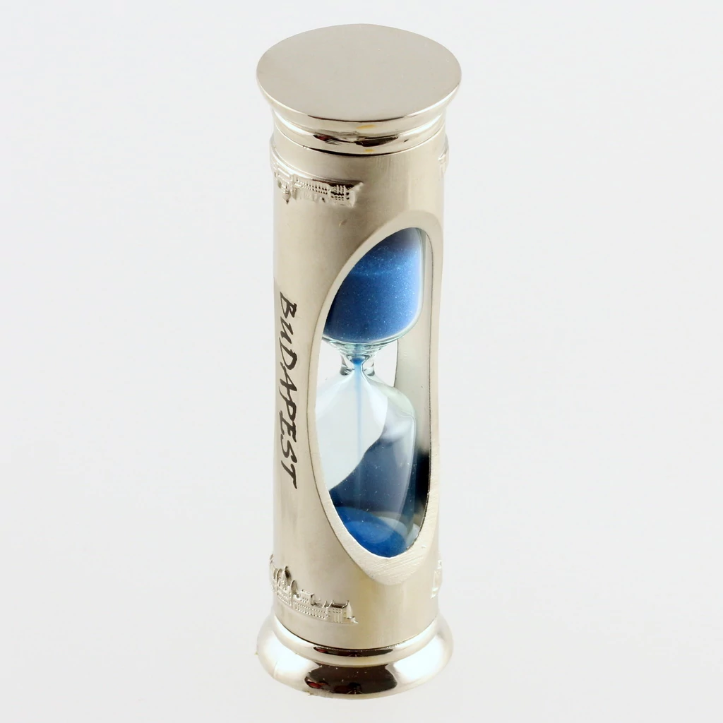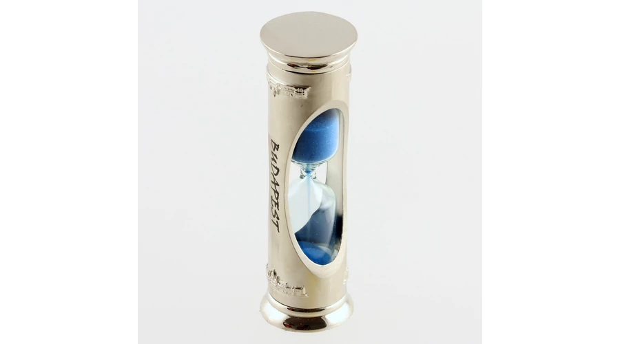 Homokóra a Souvenir1 ajándék nagykereskedés kínálatában. Fém homokóra, kék színű homokkal és Budapest felirattal az oldalán.
