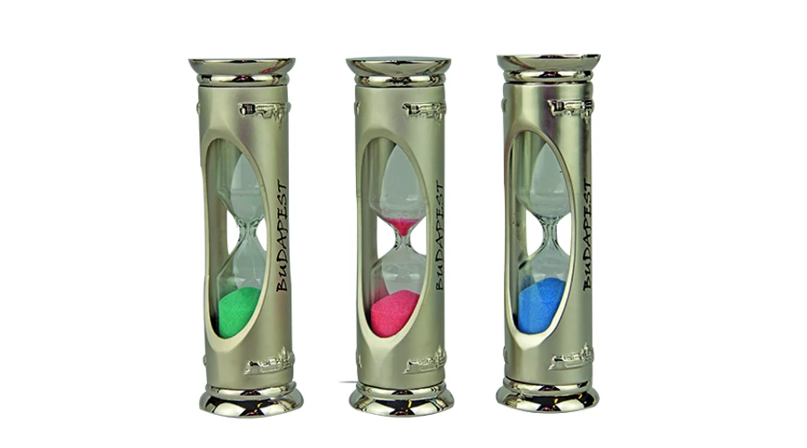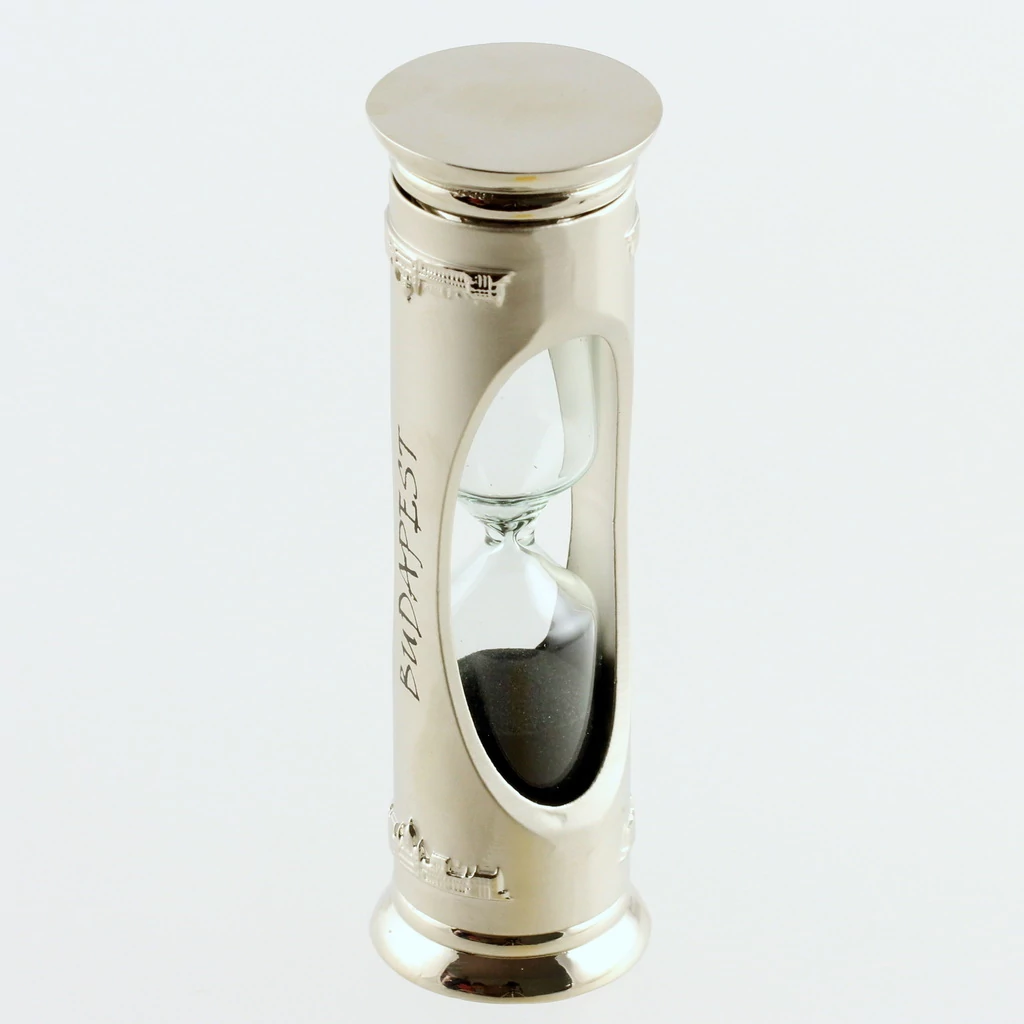 Homokóra a Souvenir1 ajándék nagykereskedés kínálatában. Fém homokóra, fekete színű homokkal és Budapest felirattal az oldalán.