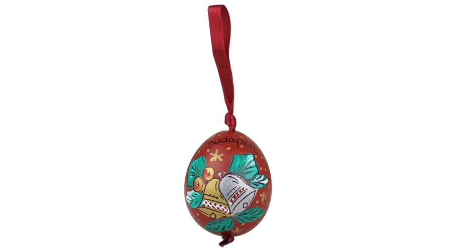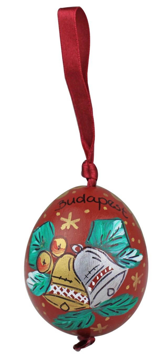 Kerámia tojás, különböző festett karácsonyi motívumokkal, Budapest felirattal.