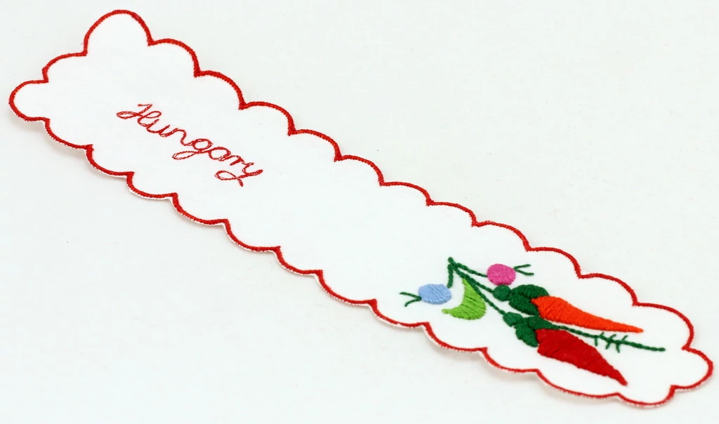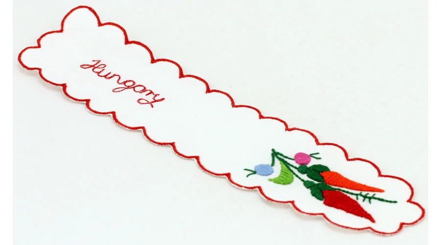 Hímzett könyvjelző a Souvenir1 ajándék nagykereskedés kínálatában. Népies, hagyományőrző szuvenír. Kézzel hímzett, kalocsai mintás könyvjelző, piros szegéllyel és Hungary felirattal.