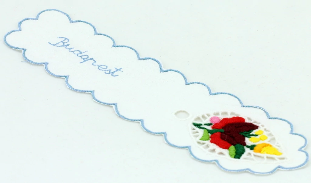 Hímzett könyvjelző a Souvenir1 ajándék nagykereskedés kínálatában. Népies, hagyományőrző szuvenír. Kézzel hímzett, kalocsai mintás riselt könyvjelző, kék szegéllyel és Budapest felirattal.