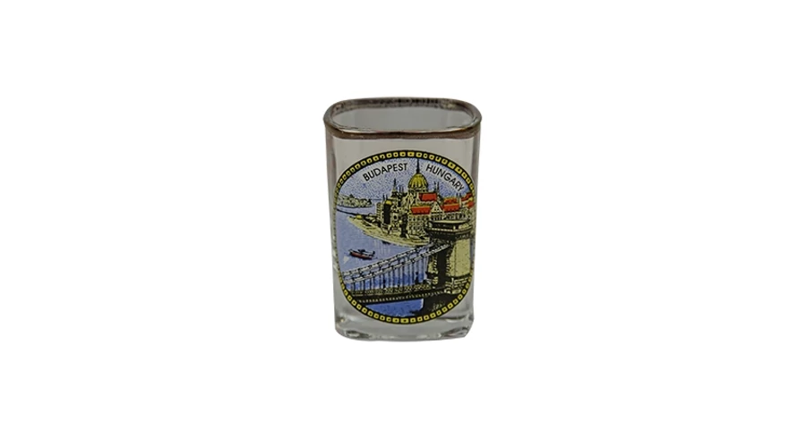 Üveg kupica, a Parlament és a Lánchíd színes grafikájával, Budapest és Hungary felirattal.