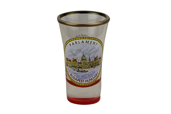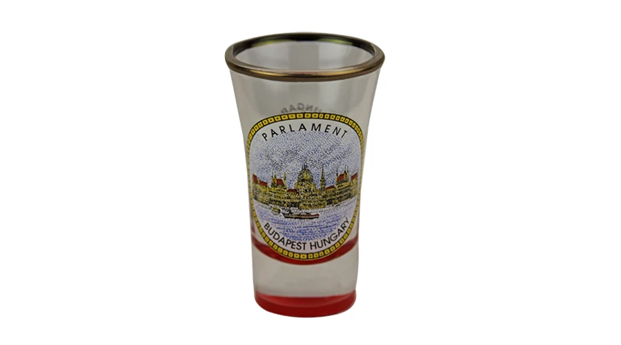 Színes üveg kupica, a Souvenir1 ajándék nagykereskedés kínálatában. Rengeteg színben, mintában kaphatóak még a szuvenír poharak. Üveg kupica a Parlament színes grafikájával, Budapest és Hungary felirattal.