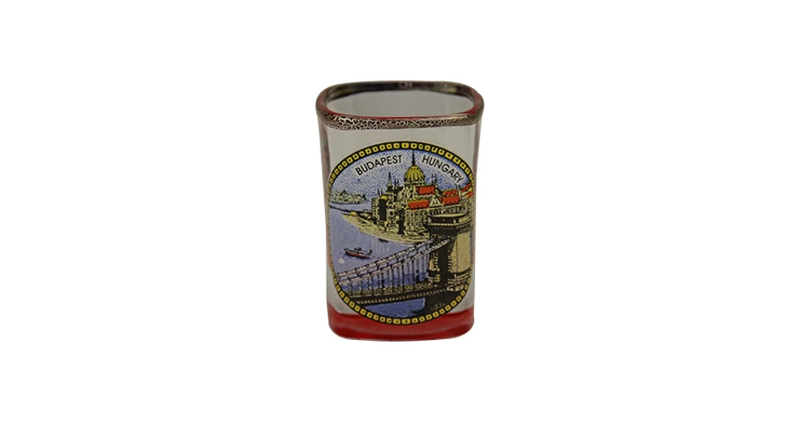 Színes üveg kupica, a Souvenir1 ajándék nagykereskedés kínálatában. Rengeteg színben, mintában kaphatóak még a szuvenír poharak. Üveg kupica a Parlament és a Lánchíd színes grafikájával, Budapest és Hungary felirattal.