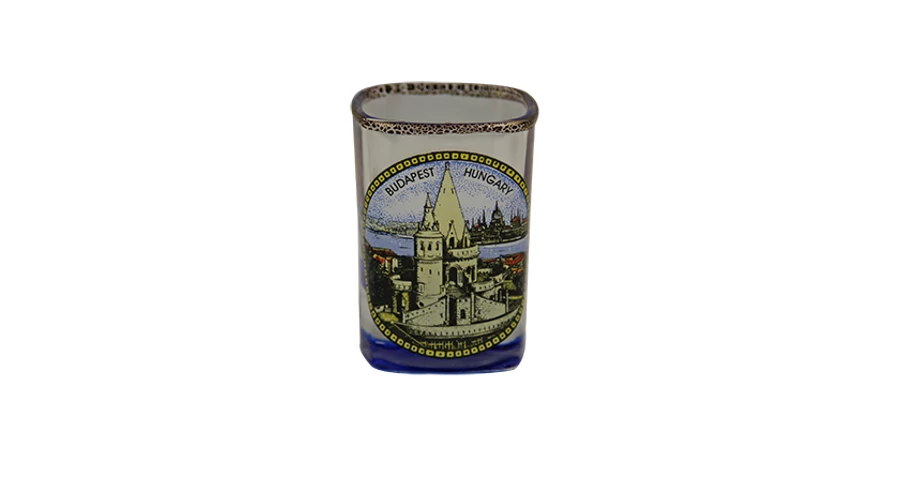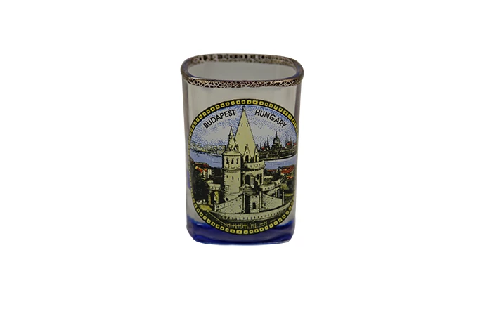 Színes üveg kupica, a Souvenir1 ajándék nagykereskedés kínálatában. Rengeteg színben, mintában kaphatóak még a szuvenír poharak. Üveg kupica a Halászbástya színes grafikájával, Budapest és Hungary felirattal.