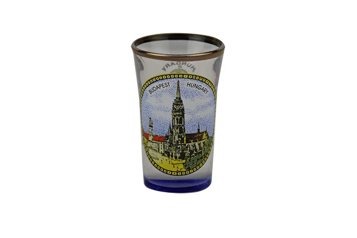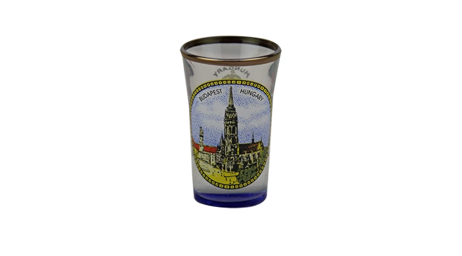 Színes üveg kupica, a Souvenir1 ajándék nagykereskedés kínálatában. Rengeteg színben, mintában kaphatóak még a szuvenír poharak. Üveg kupica a Mátyás templom színes grafikájával, Budapest és Hungary felirattal.