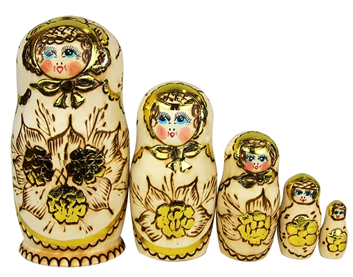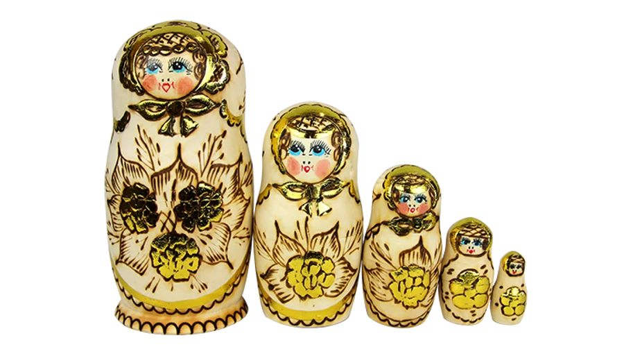 Matrioska a Souvenir1 ajándék nagykereskedés kínálatában. Jellegzetes kelet-európai dísztárgy. 5 db egymásba rakható fa matrioska baba.