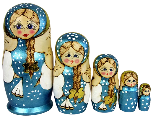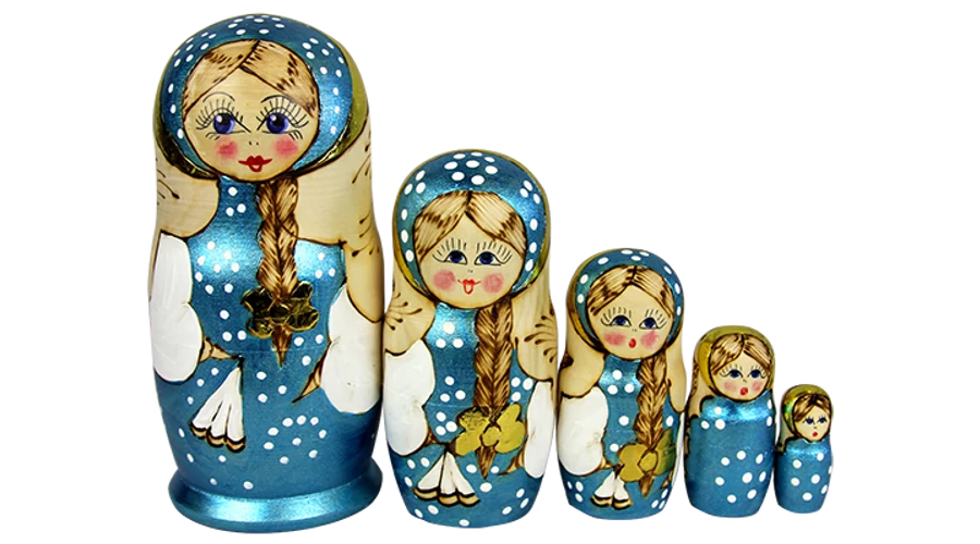 Matrioska a Souvenir1 ajándék nagykereskedés kínálatában. Jellegzetes kelet-európai dísztárgy. 5 db egymásba rakható fa matrioska baba.