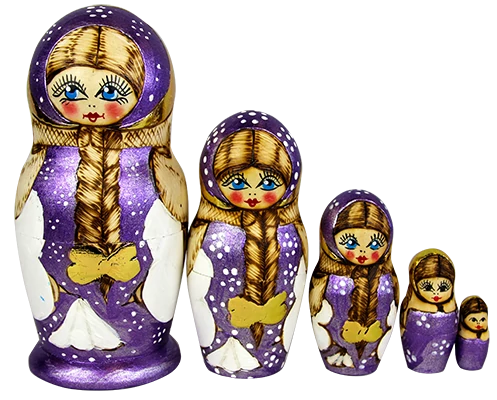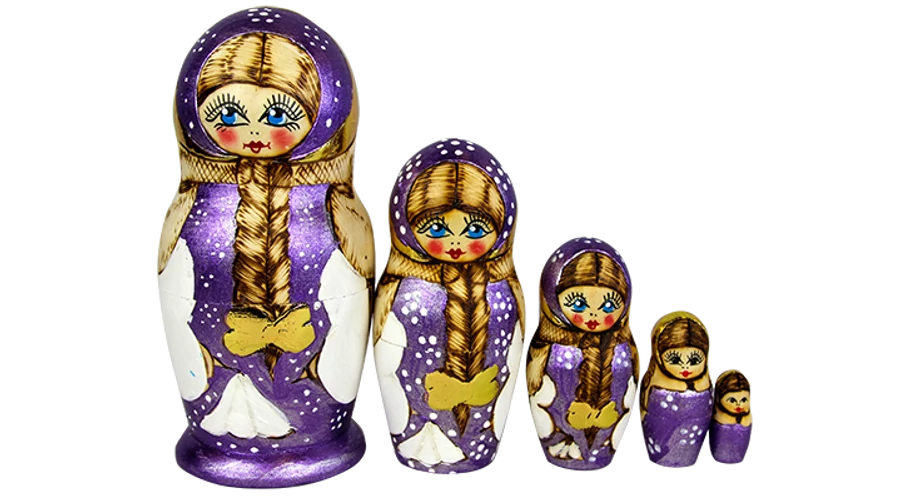 Matrioska a Souvenir1 ajándék nagykereskedés kínálatában. Jellegzetes kelet-európai dísztárgy. 5 db egymásba rakható fa matrioska baba.