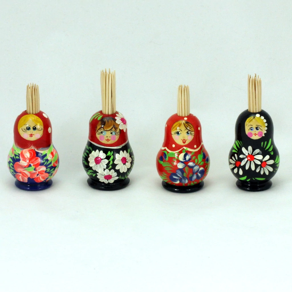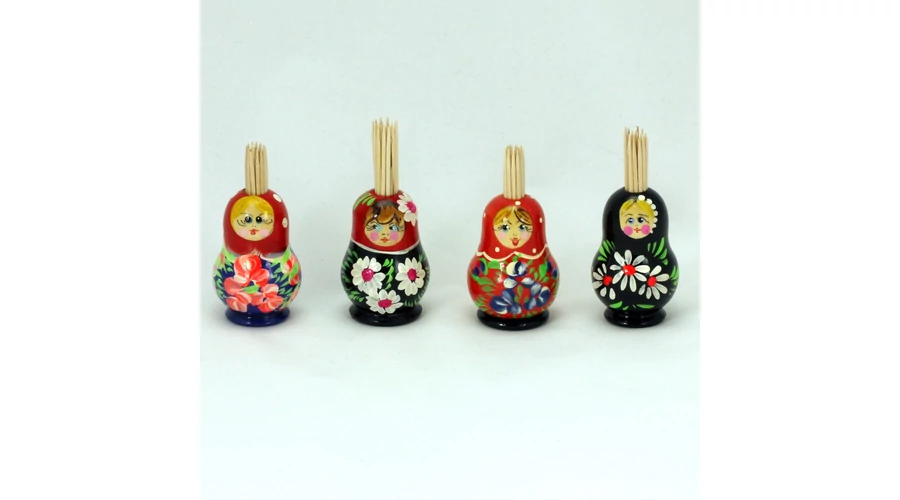 Matrioska a Souvenir1 ajándék nagykereskedés kínálatában. Fogvájók dekoratív tárolására alkalmas, fából készült matrioska figura. Kézzel festett, különböző színekben kapható. Visszazárható műanyag tasakban szállítjuk.
