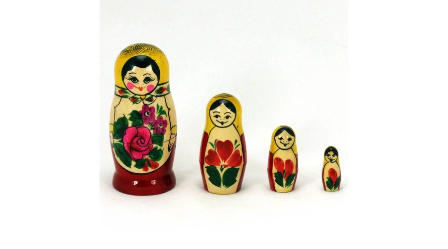Matrioska a Souvenir1 ajándék nagykereskedés kínálatában. Fából készült, jellegzetes kelet-európai dísztárgy, 4 db egymásba rakható matrioska baba. A termékek kézzel készültek, ezért a megadott méretektől és mintáktól minimális eltérés lehetséges.