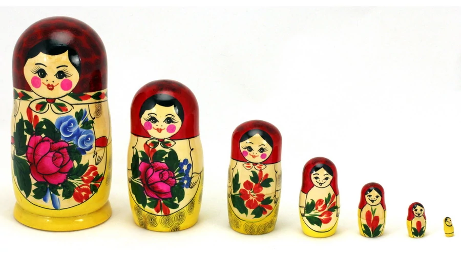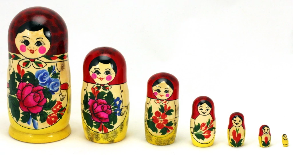 Matrioska a Souvenir1 ajándék nagykereskedés kínálatában. Fából készült, jellegzetes kelet-európai dísztárgy, 7 db egymásba rakható matrioska baba. A termékek kézzel készültek, ezért a megadott méretektől és mintáktól minimális eltérés lehetséges.