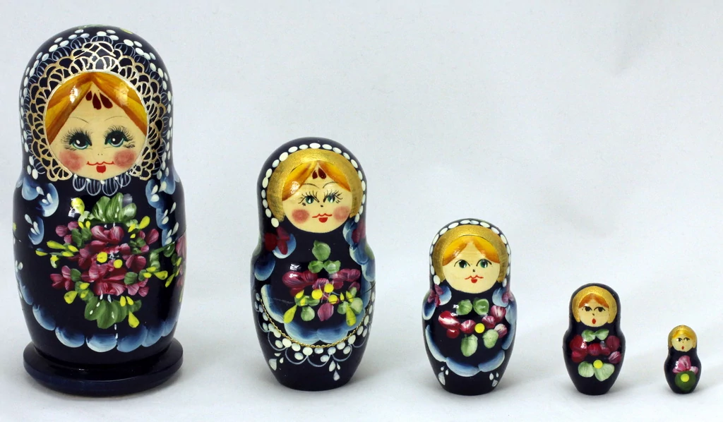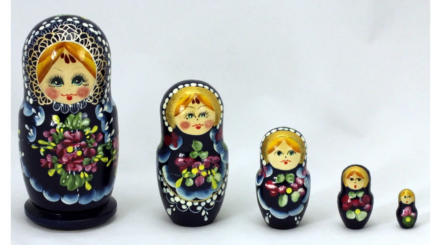 Matrioska a Souvenir1 ajándék nagykereskedés kínálatában. Jellegzetes kelet-európai dísztárgy, 5db egymásba rakható fa matrioska baba. A termékek kézzel készültek, ezért változatos mintákkal kaphatóak. A megadott méretektől és mintáktól minimális eltérés lehetséges.