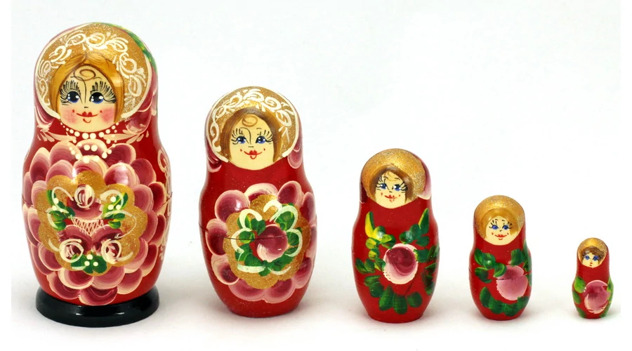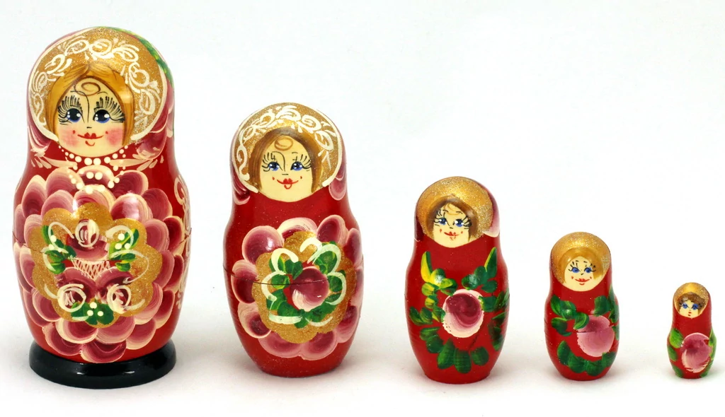 Matrioska a Souvenir1 ajándék nagykereskedés kínálatában. Jellegzetes kelet-európai dísztárgy, 5db egymásba rakható fa matrioska baba. A termékek kézzel készültek, ezért változatos mintákkal kaphatóak. A megadott méretektől és mintáktól minimális eltérés lehetséges.