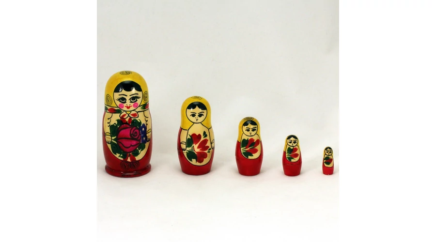 Matrioska a Souvenir1 ajándék nagykereskedés kínálatában. Fából készült, jellegzetes kelet-európai dísztárgy, 5 db egymásba rakható matrioska baba. A termékek kézzel készültek, ezért a megadott méretektől és mintáktól minimális eltérés lehetséges.