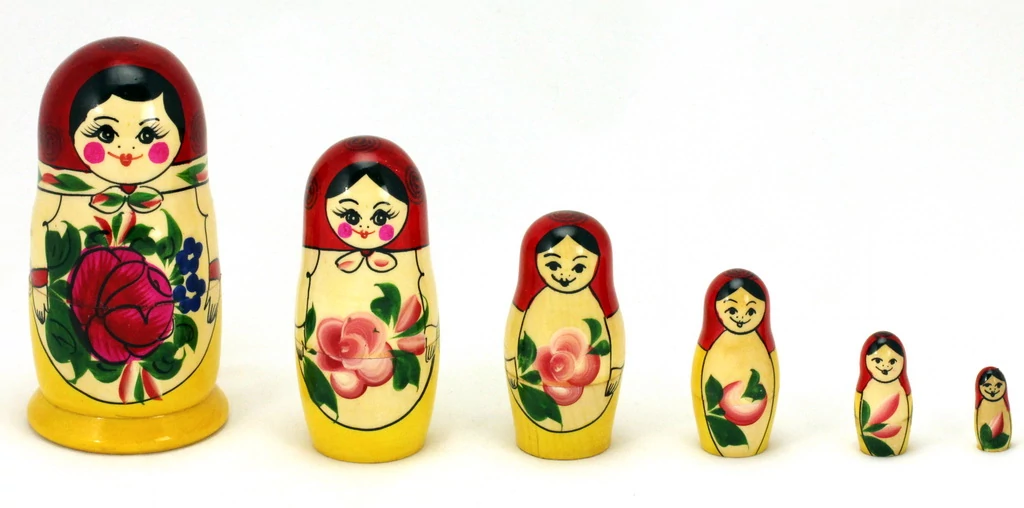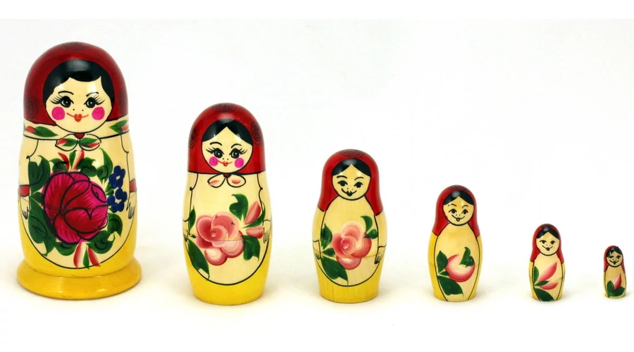 Matrioska a Souvenir1 ajándék nagykereskedés kínálatában. Fából készült, jellegzetes kelet-európai dísztárgy, 6 db egymásba rakható matrioska baba. A termékek kézzel készültek, ezért a megadott méretektől és mintáktól minimális eltérés lehetséges.