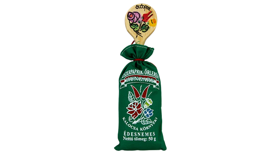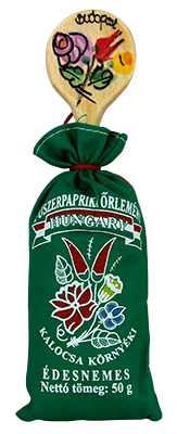 Pirospaprika a Souvenir1 ajándék nagykereskedés kínálatában. Kalocsai mintás zsákban található egy kis fakanál és édes, Kalocsa környéki pirospaprika.