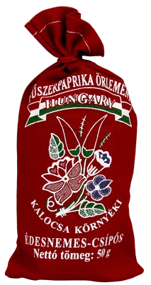 Pirospaprika a Souvenir1 ajándék nagykereskedés kínálatában. Kalocsa környéki, csípős pirospaprika, 50 grammos zsákban.