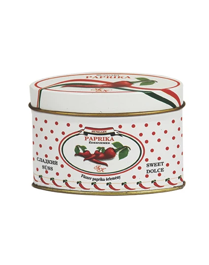 Pirospaprika a Souvenir1 ajándék nagykereskedés kínálatában. Kalocsa környéki, édes pirospaprika, fémdobozban.