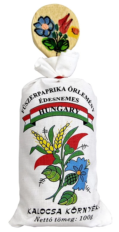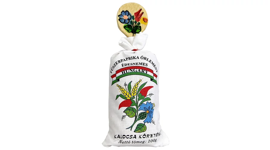 Pirospaprika a Souvenir1 ajándék nagykereskedés kínálatában. Fehér színű, kalocsai mintás zsákban található egy kis fakanál és édes, Kalocsa környéki pirospaprika.