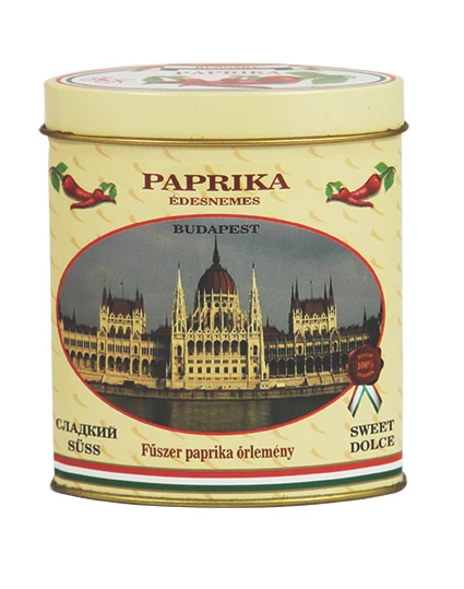 Pirospaprika a Souvenir1 ajándék nagykereskedés kínálatában. Kalocsa környéki édes pirospaprika fémdobozban, a Parlament fotójával.