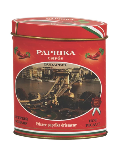 Pirospaprika a Souvenir1 ajándék nagykereskedés kínálatában. Kalocsa környéki csípős pirospaprika fémdobozban, a Lánchíd fotójával.