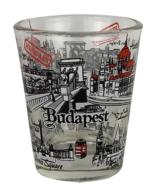 Üveg pálinkás pohár, Budapest nevezetességeivel, Budapest és Hungary felirattal.
