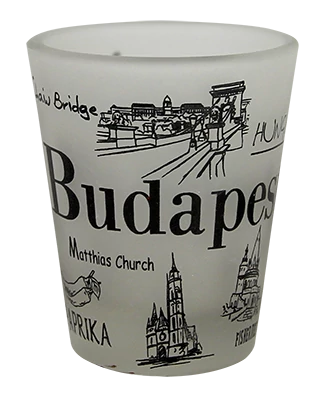 Fúvott üveg pálinkás pohár, Budapest nevezetességeivel, Budapest és Hungary felirattal.