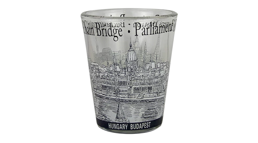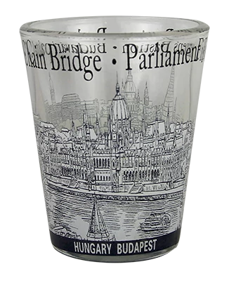 Fúvott üveg pálinkás pohár, Budapest nevezetességeivel, Budapest és Hungary felirattal.