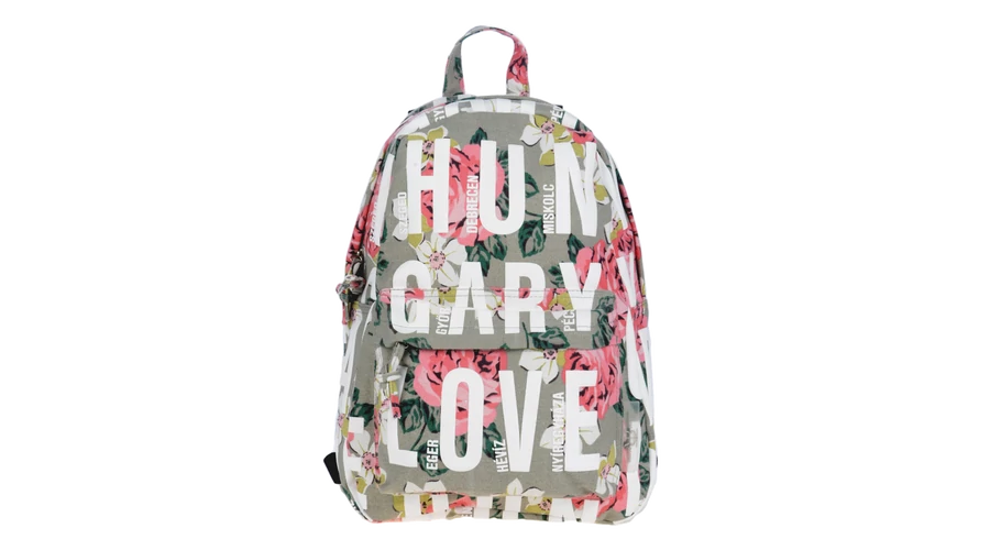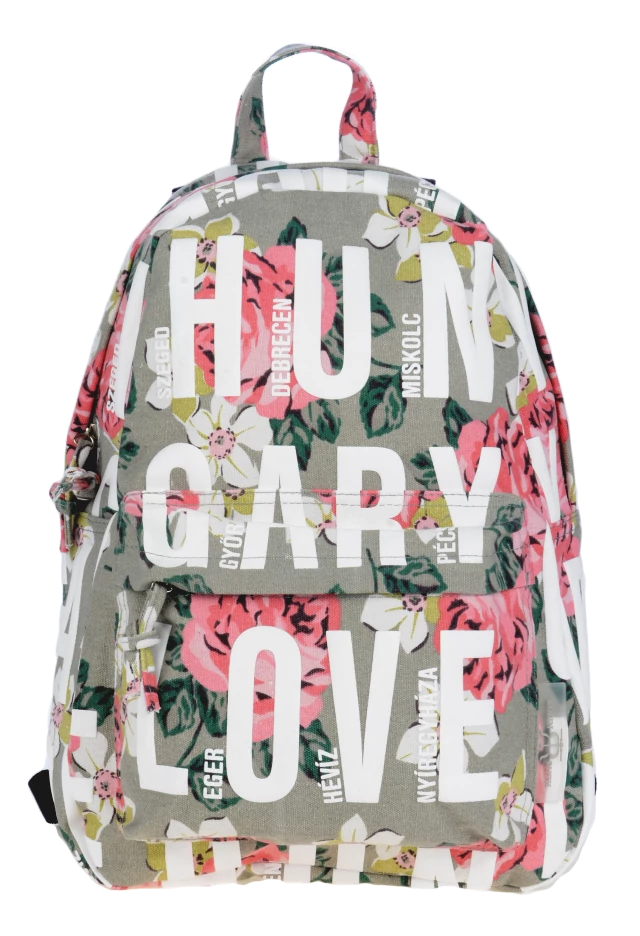 Női, Robin Ruth márkájú design hátizsák világosbarna alapon, színes virágokkal, Hungary felirattal és más városnevekkel. (Szeged, Debrecen, Miskolc, Győr, Pécs, Eger, Hévíz, Nyíregyháza)