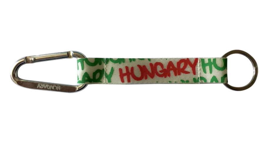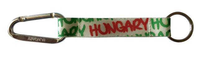 Robin Ruth márkájú design kulcstartó. Karabíneres kulcstartó, fehér alapon piros és zöld Hungary felirattal.