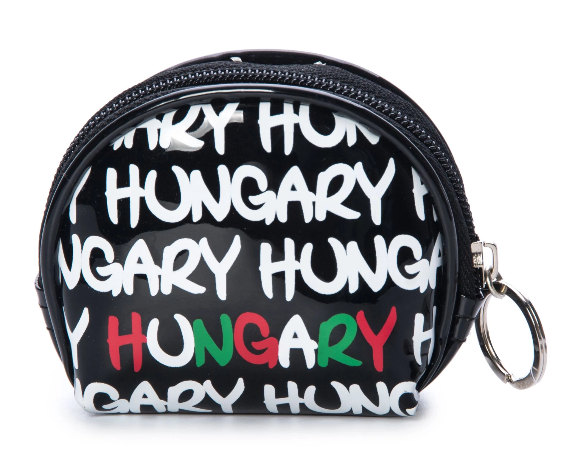 Női, Robin Ruth márkájú design pénztárca. Cipzáros pénztárca, fekete alapon, piros, fehér és zöld színben, Hungary felirattal.