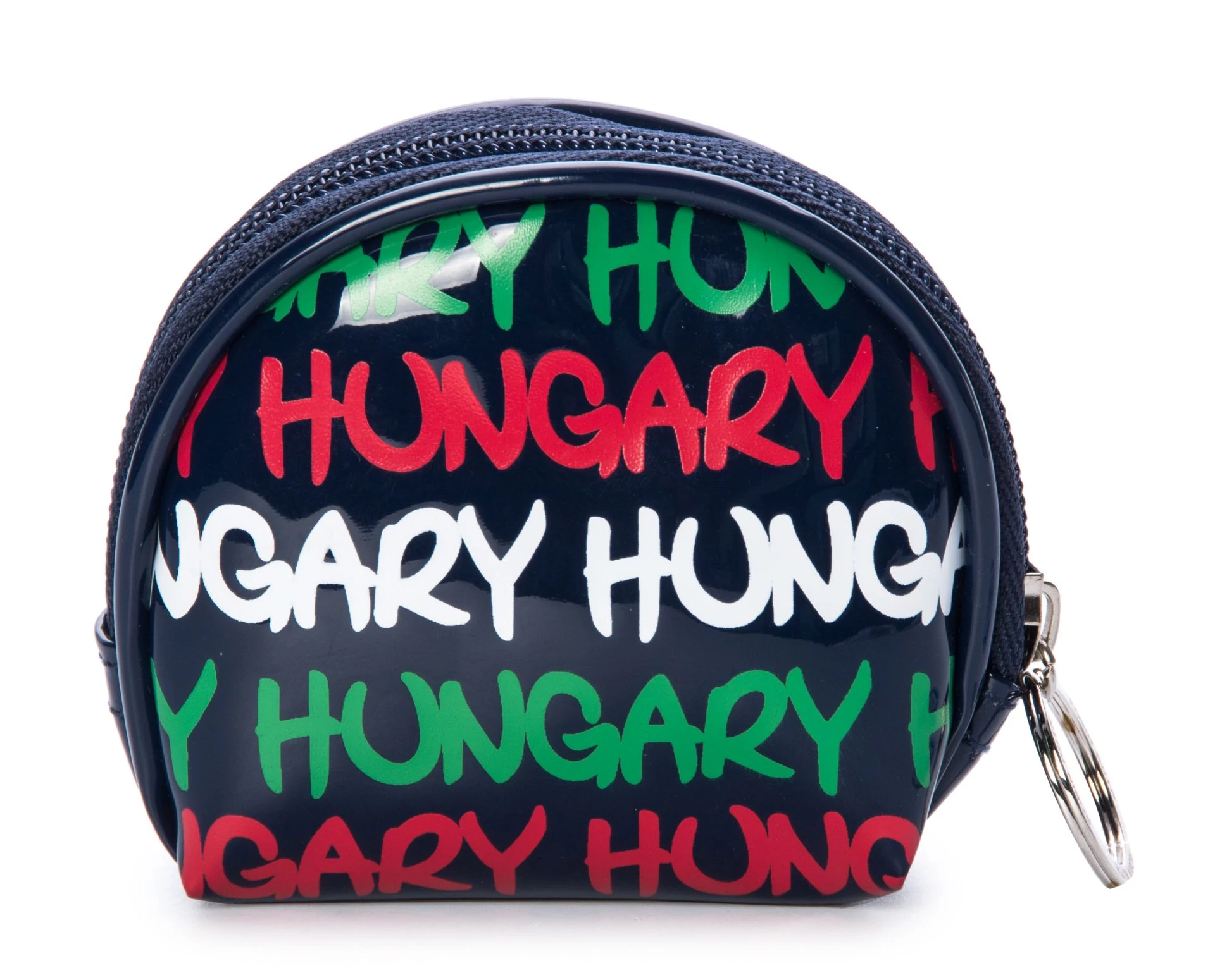 Női, Robin Ruth márkájú design pénztárca. Cipzáros pénztárca, sötétkék alapon, piros, fehér és zöld színben, Hungary felirattal.