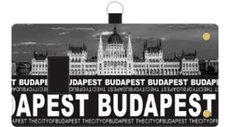 Unisex, Robin Ruth márkájú tépőzáras pénztárca. Sötét alapon, fehérrel a Parlament, alatta fehér betűkkel a Budapest felirat.