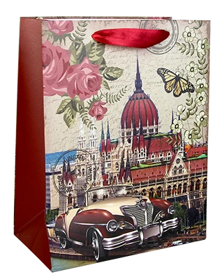 Dísztasak a Souvenir1 ajándék nagykereskedés kínálatában. Közepes méretű ajándék zacskó a Parlament színes grafikájával.