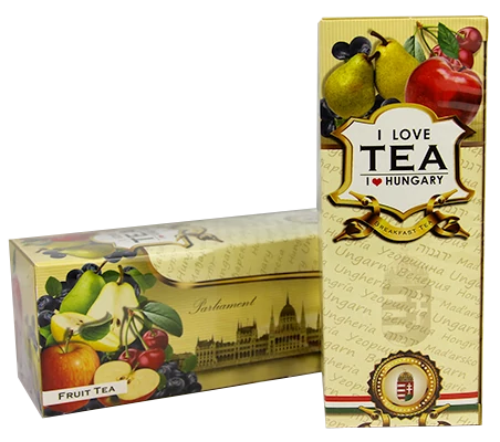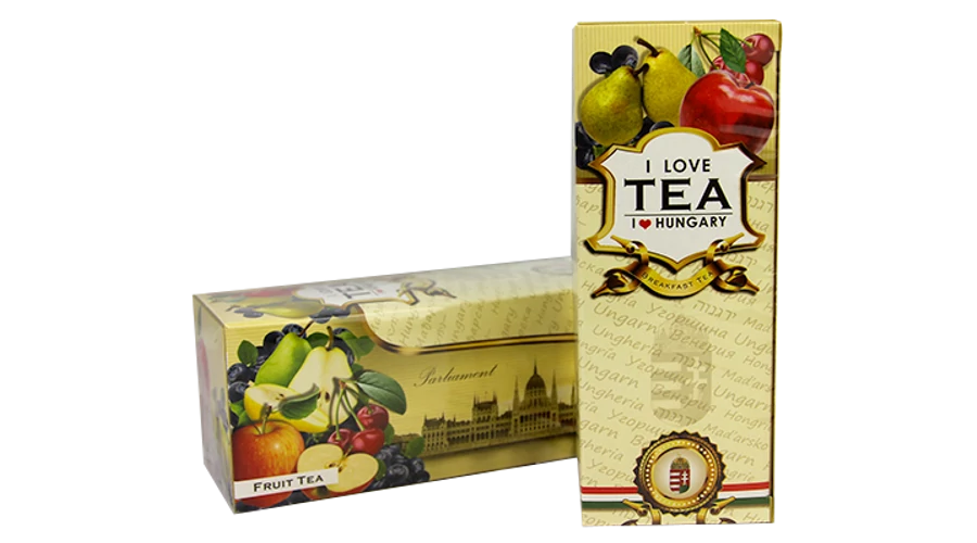 Gyümölcstea a Souvenir1 ajándék nagykereskedés kínálatában. Vegyes gyümölcs ízesítésű teafilterek, a Parlament és a Lánchíd képével ellátott dobozban.
