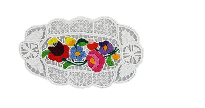 Kalocsai terítő a Souvenir1 ajándék nagykereskedés kínálatában. Népies, hagyományőrző szuvenir. Kézzel hímzett kalocsai terítő. Ovális, kalocsai mintás.
