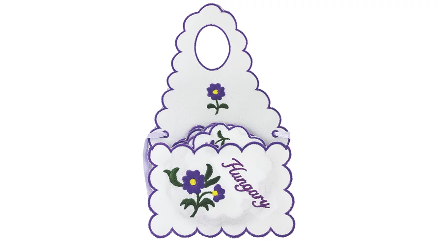 Hímzett üvegkötény és alátét a Souvenir1 ajándék nagykereskedés kínálatában. Népies, hagyományőrző szuvenír. Hímzett üvegkötény, alátétekkel, Hungary felirattal és lila szegéllyel.